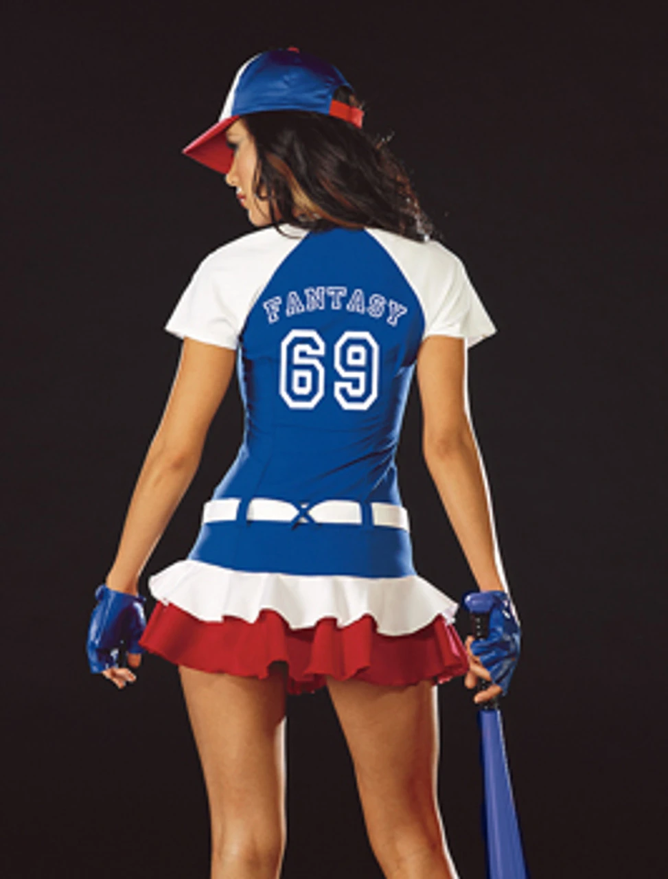 Fantasy Player comes with zipper front dress with double flounce hem. Includes hat, belt, glvoes and inflatable bat.