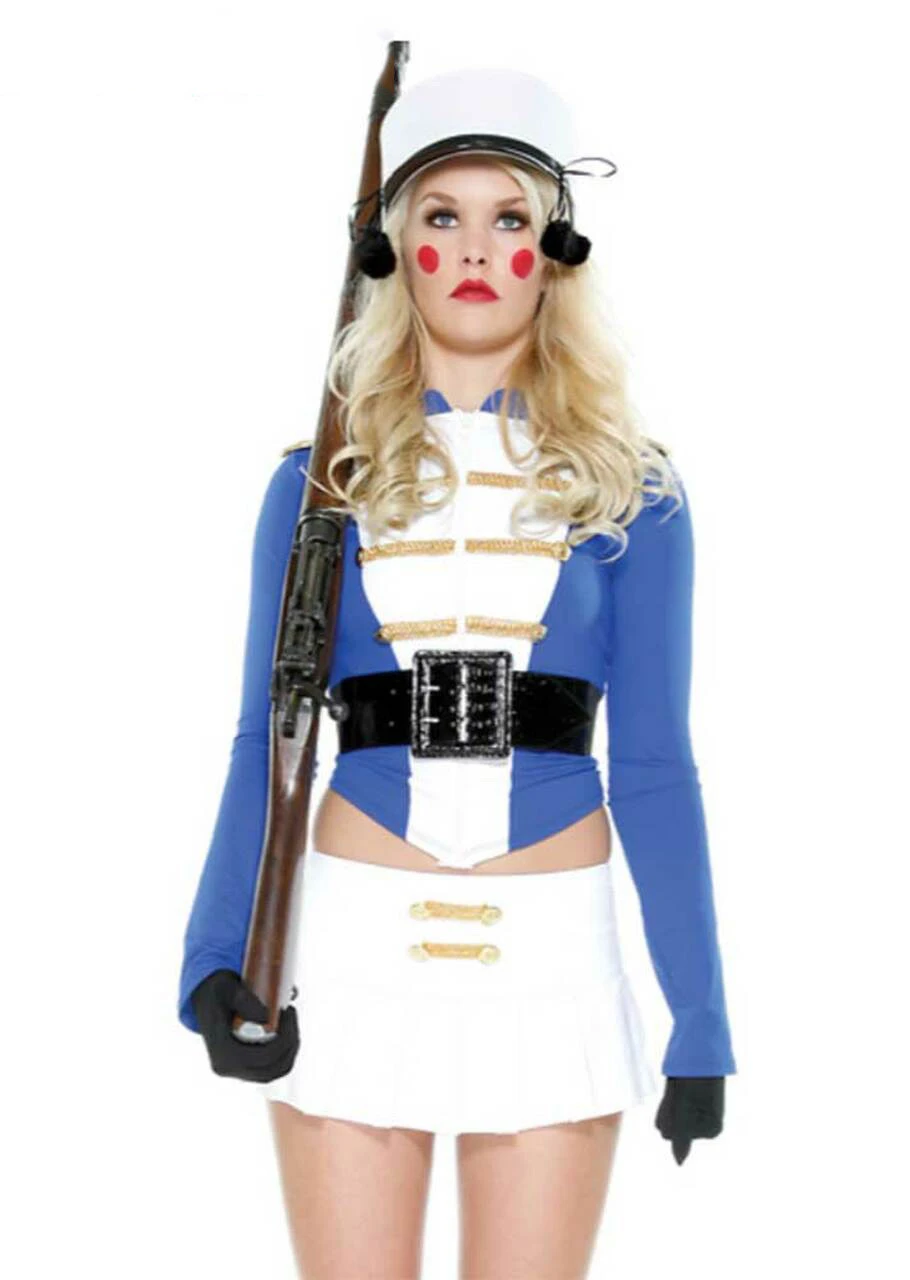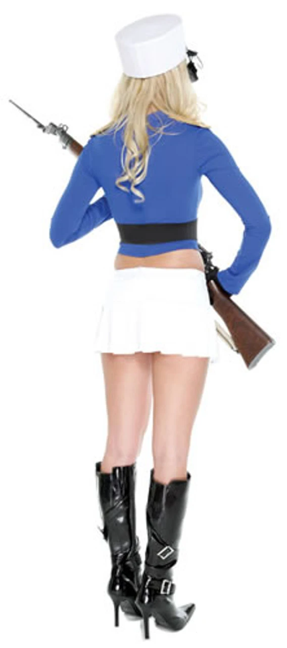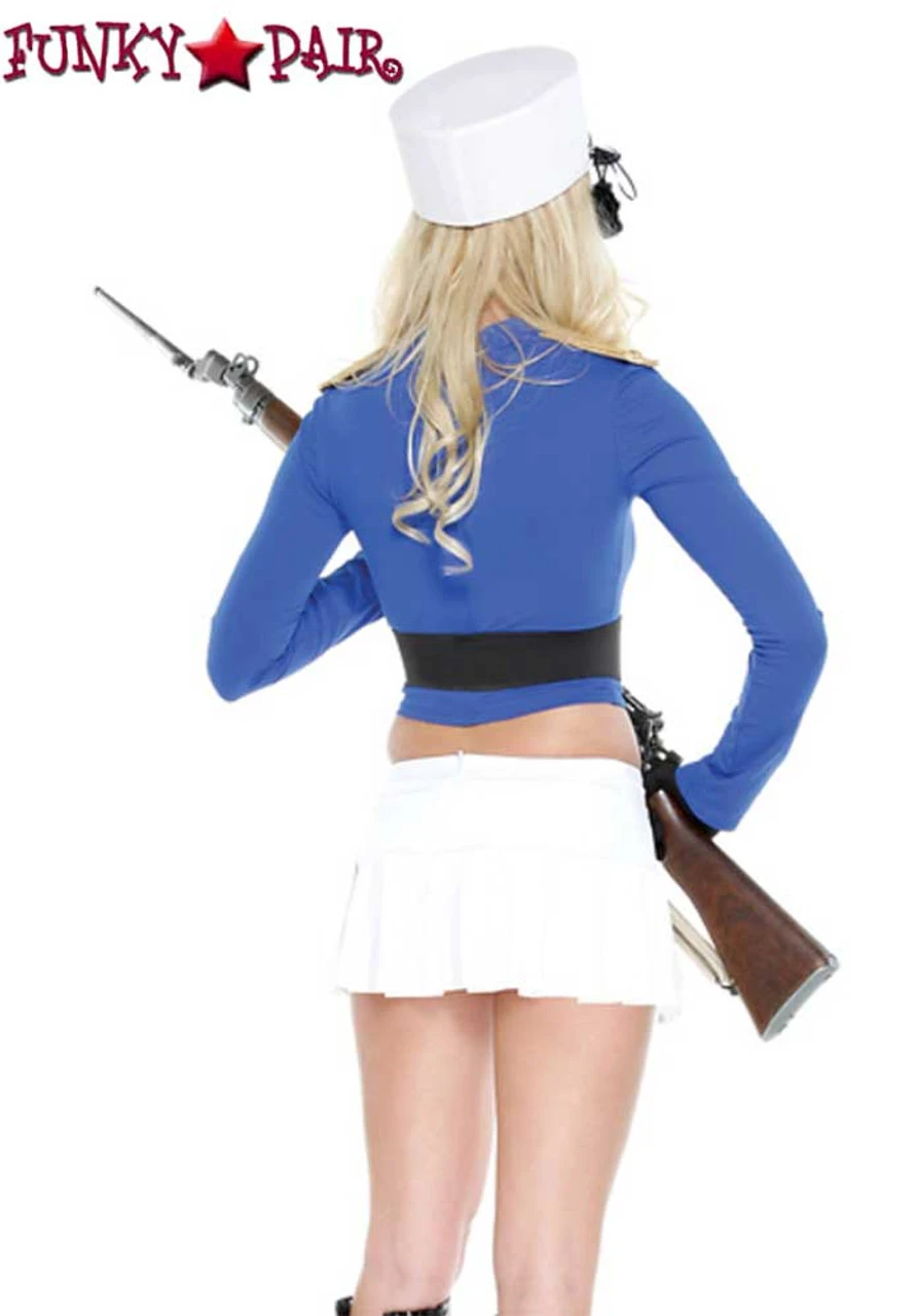 Attention! This sharp little two piece is a sexy twist to the classic Toy Soldier look. The long sleeve top is scalloped at the midriff, and the skirt is pleated and short with matching ornamentl trim. Soldier hat, black buckle belt and gloves also included. One, two, step!