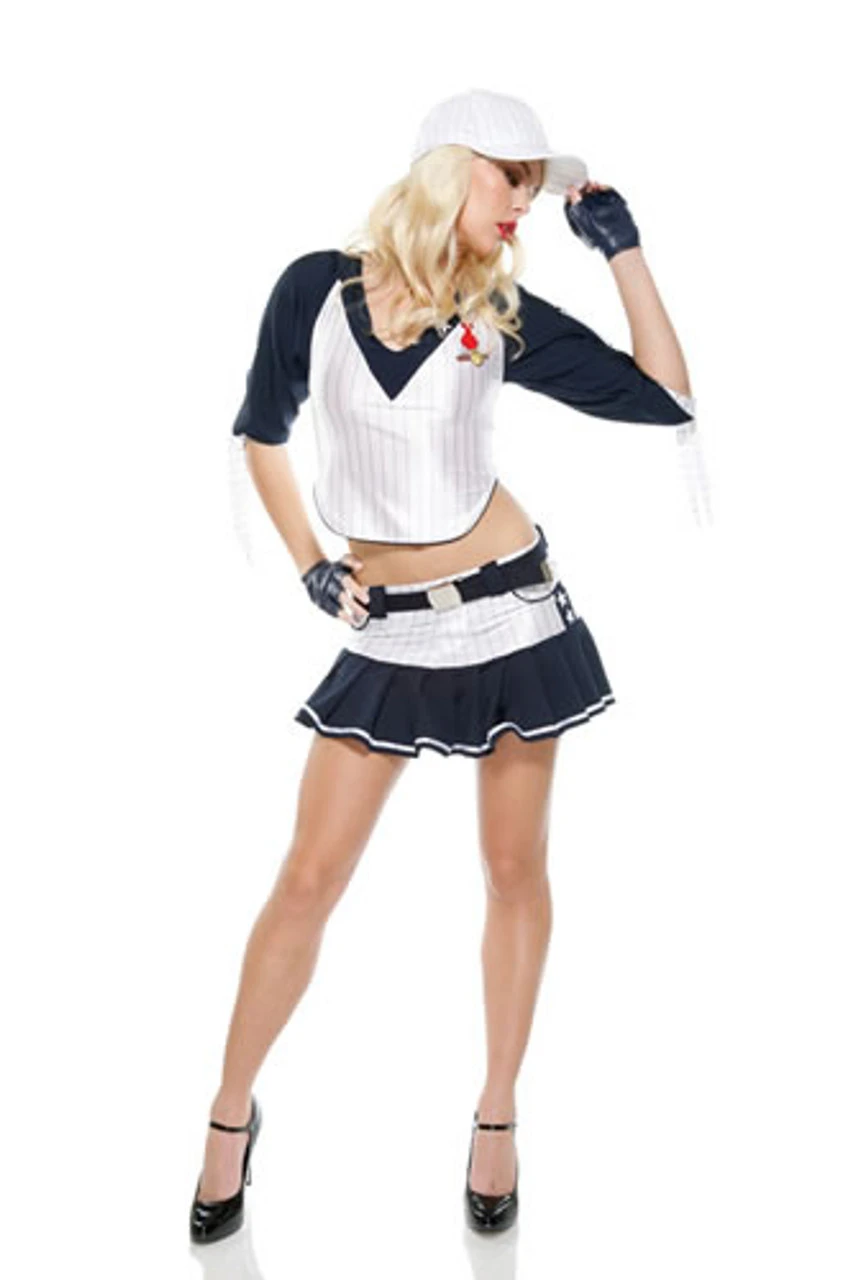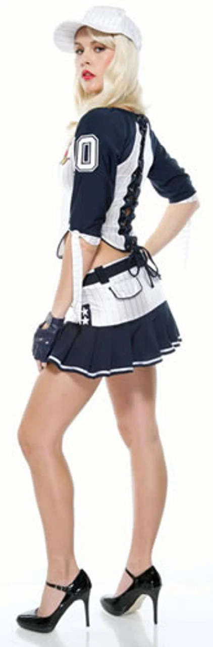 Step up to the plate in Batter Babe. This pinstripe v-neck ringer t-shirt with lace up back anad pleated pinstripe miniskirt will have you swinging for the fences. Complete with traditional cap, buckle belt, and batting gloves