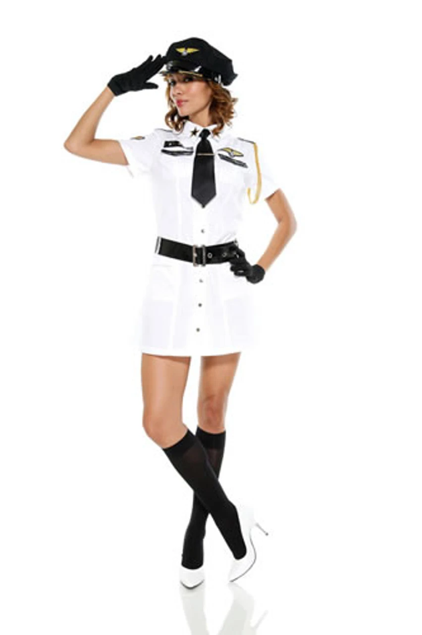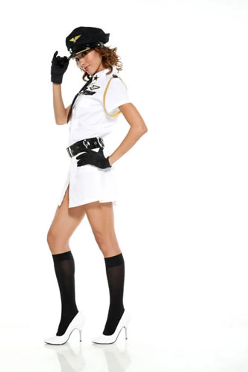 There won’t be any flybys when you wear this sassy dress. The short-sleeves, crisp collar, tie with gold clip, and impressive patches won’t fool anyone-the silver snaps from top to bottom and mini hemline will keep you soaring! Dress comes with captain’s hat, vinyl belt, and gloves to complete the outfit.