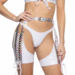 Black Holographic PVC/ Prism Vinyl Lace-Up Chaps, Fabric: 90% POLYESTER 10% SPANDEX, Made in USA, Wash: Hand Wash Cold