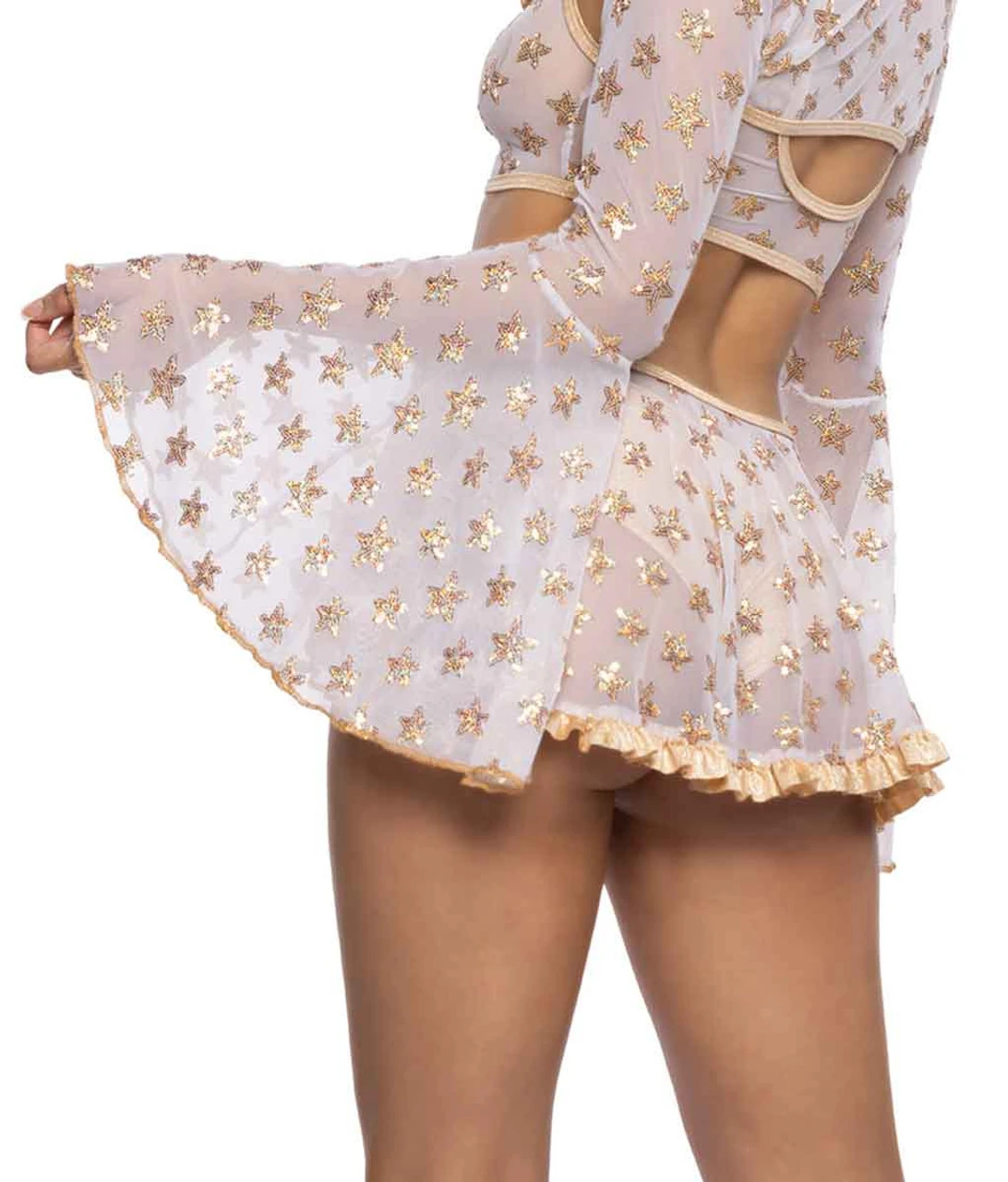 Gold Sequin Star Stretch Mesh Ruffle Skirt with Tie Front, Fabric: 85% POLYESTER 15% SPANDEX, Made in USA, Wash: Hand Wash Cold