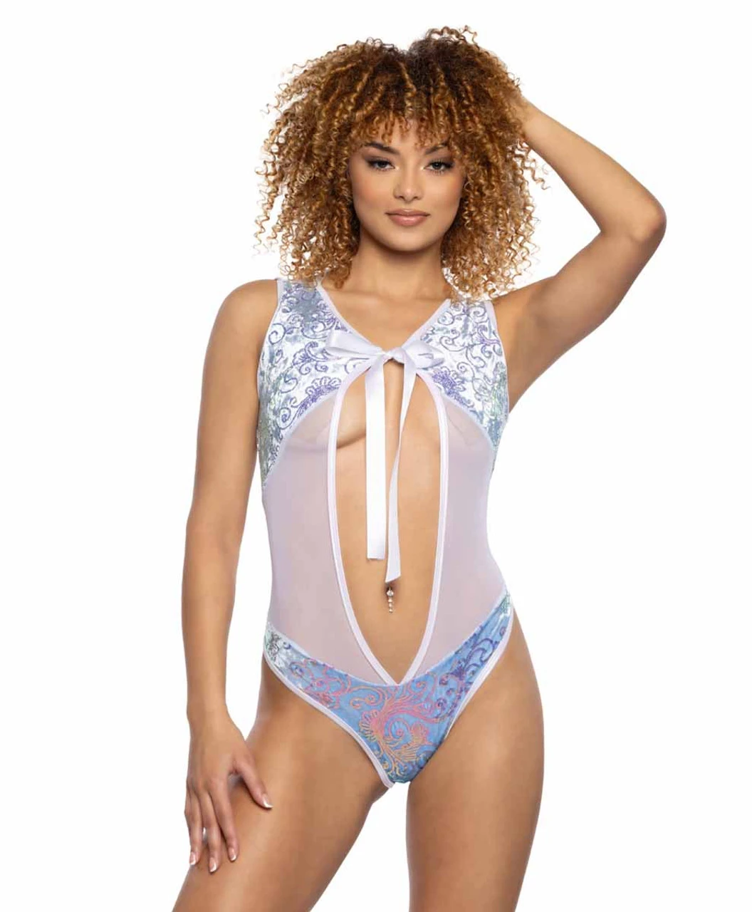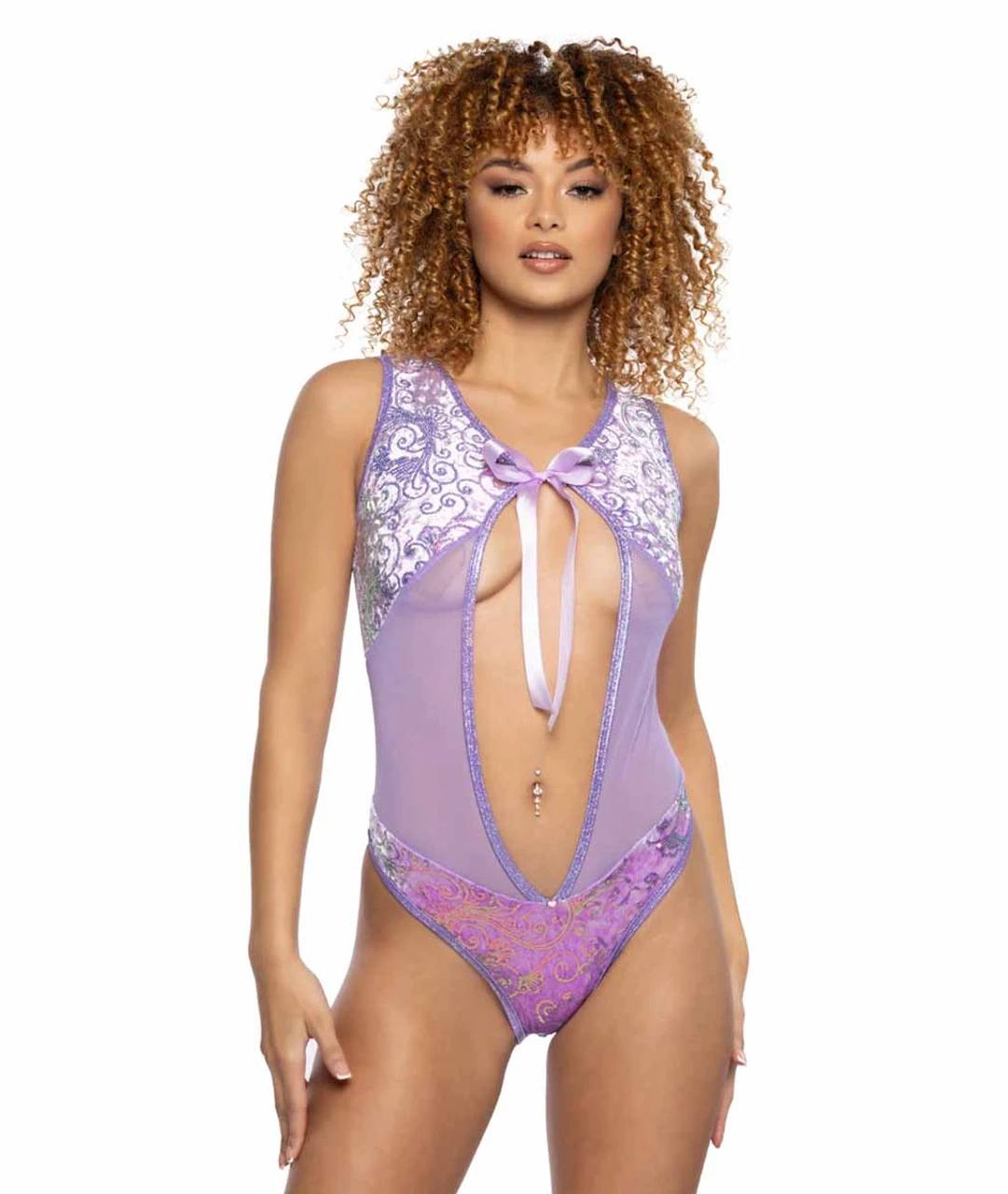 Sequin Velvet Bow Bodysuit with Cheeky Back, Fabric: 90% POLYESTER 10% SPANDEX, Made in USA, Wash: Hand Wash Cold