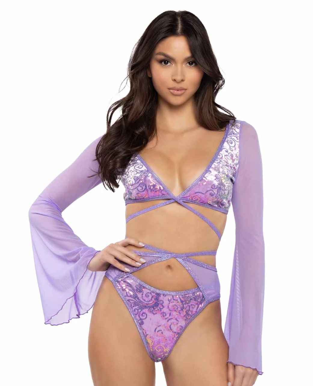 Sequin Velvet Wrap Top with Mesh Sleeves, Fabric: 90% POLYESTER 10% SPANDEX, Made in USA, Wash: Hand Wash Cold