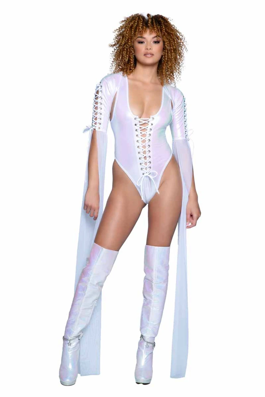 White Unicorn Lace-Up Bodysuit, Fabric: 85% POLYESTER 15% SPANDEX, Made in USA, Wash: Hand Wash Cold
