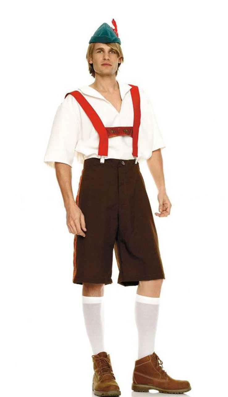 4PC. Men’s Lederhosen Costume, includes hat, shirt, suspenders, and shorts.