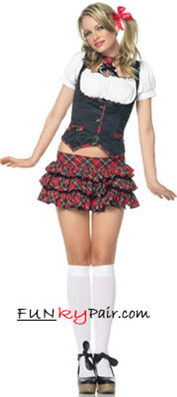 3pc Lil’ Miss Naughty School Girl Costume, includes tie with badge applique, peasant top dress and ruffled plaid skirt