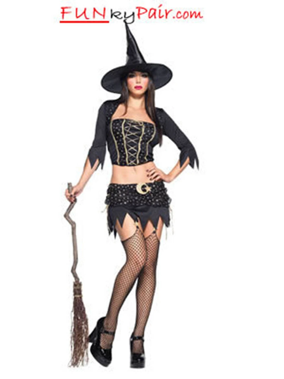 4pc Mystical Witch Costume, includes garter skirt with moon and star applique, bustier, shrug and hat.