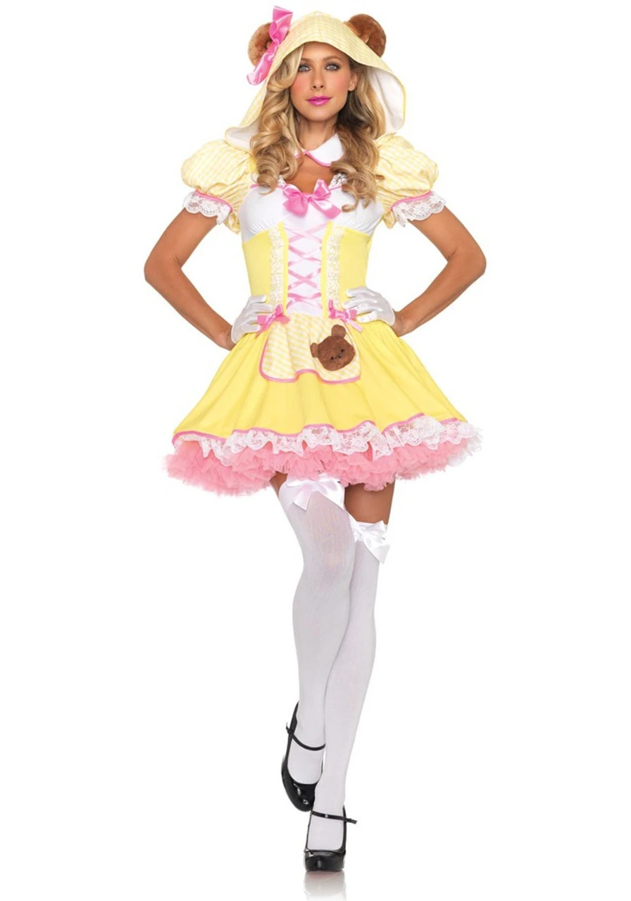 2 pc. Includes ruffle trimmed apron dress with plush bear accent, attached gingham ear hood, and matching collar choker. Petticoat and hosiery sold separately