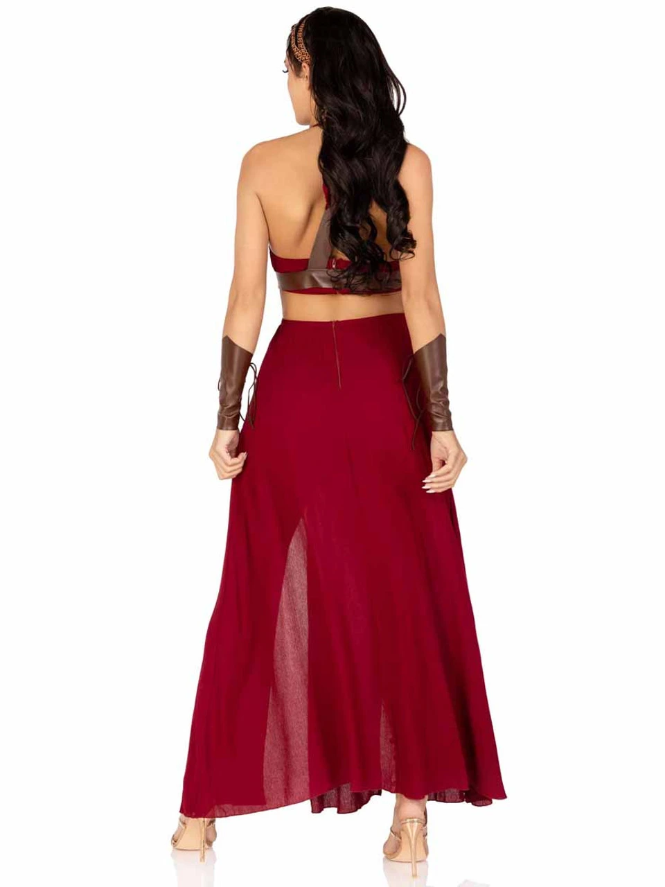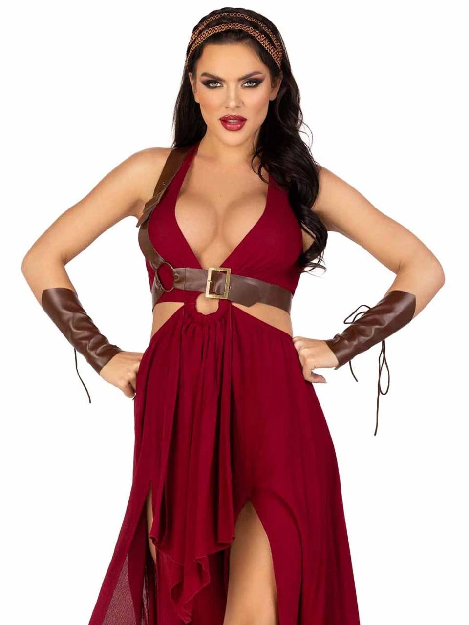 4pc. Warrior Maiden costume includes gauze cut out O-ring dress, shoulder harness, headband, and matching arm cuffs