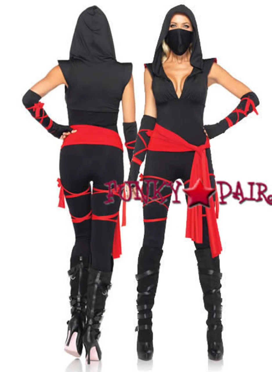 5pc. Deadly Ninja costume, Includes deep V jumpsuit with shoulder guards, waist sash, arm warmers with attached wraps, face mask, and leg wraps.
