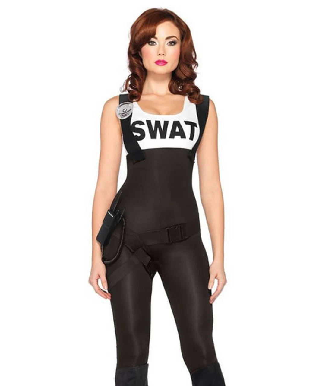 3 PC. SWAT Bombshell costume, includes suspender jumpsuit with badge detail, belt, and toy walkie talkie