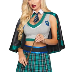 3 PC Sinister Spellcaster, includes crop top with badge accent, high waist plaid skirt, and cape with attached tie.