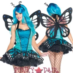 3 pc. Includes sequin trimmed satin bustier, layered glitter tulle wing patterend tutu skirt, and antennae headband