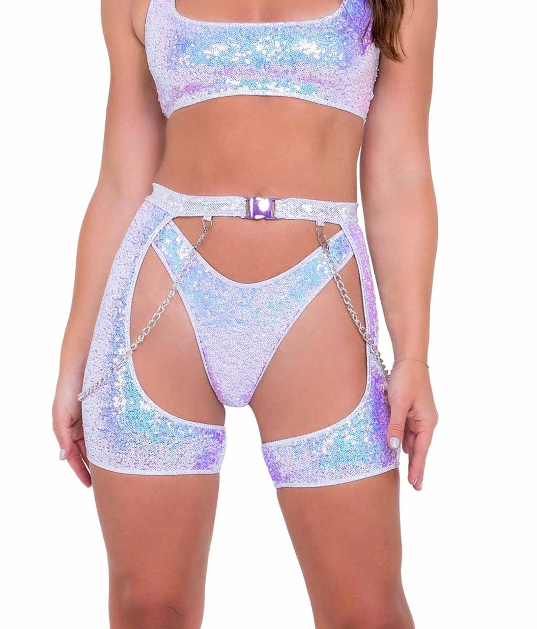 Sequin Chap Shorts with Buckle Closure and Chain Detail