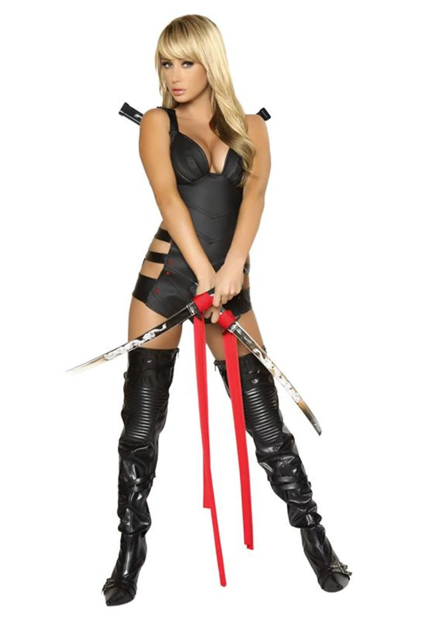 Ninja Girl Costume includes side cutout romper with straps and stud detail, pair of swords with matching tie detail