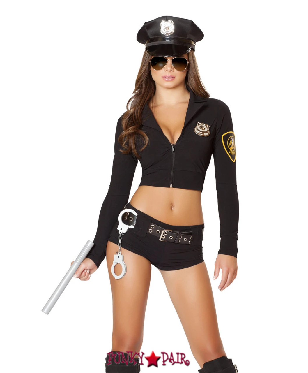 7 PC. Officer Hottie, includes hat, zip-up long sleeve crop top, black boyshort, belt, badge, handcuffs and baton. (sunglasses not included)