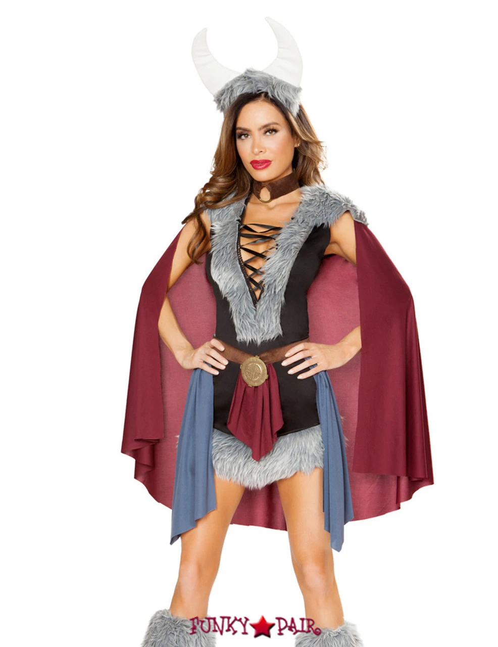 5 PC. Shieldmaiden Viking costume includes, black lace-up dress grey faux fur detail, burgundy cape, burgundy belt with attached panel, o-ring choker and white horns. Sword, shield and boot cover sold separately