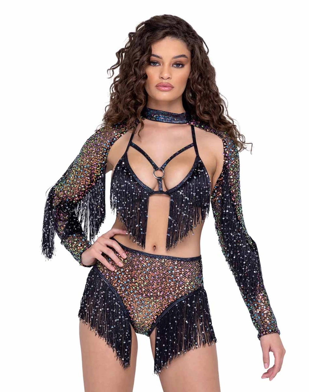 Roma R-6220 – Fringe Sequin Fishnet Triangle Tie Top