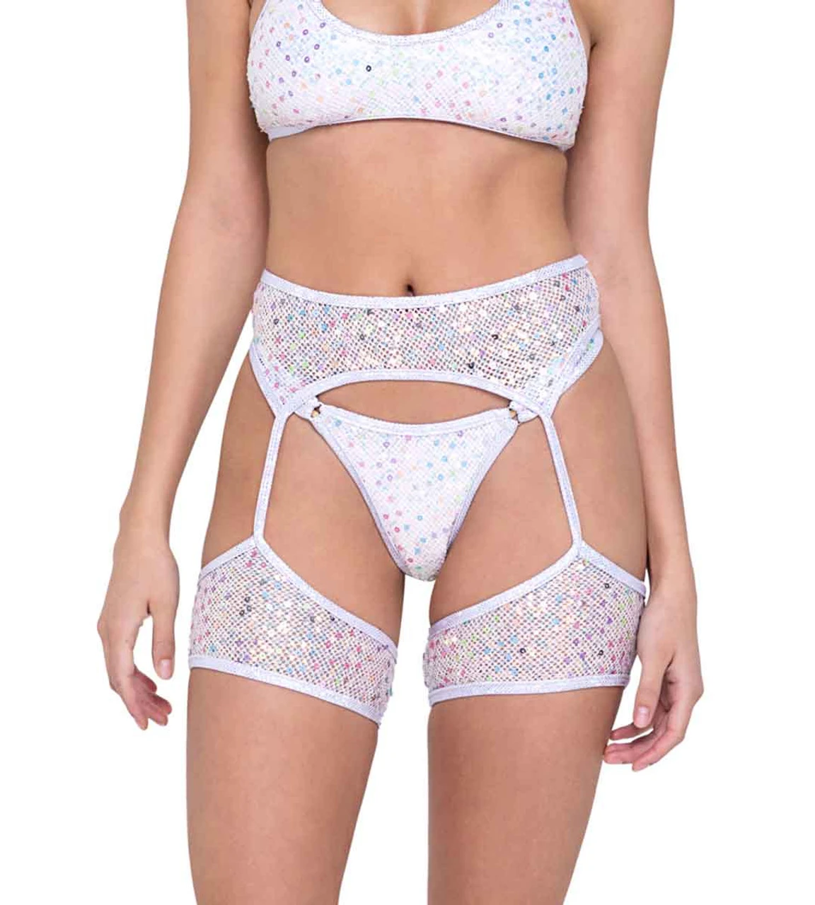 Sequin Fishnet Garter Belt with Attached Leg Strap