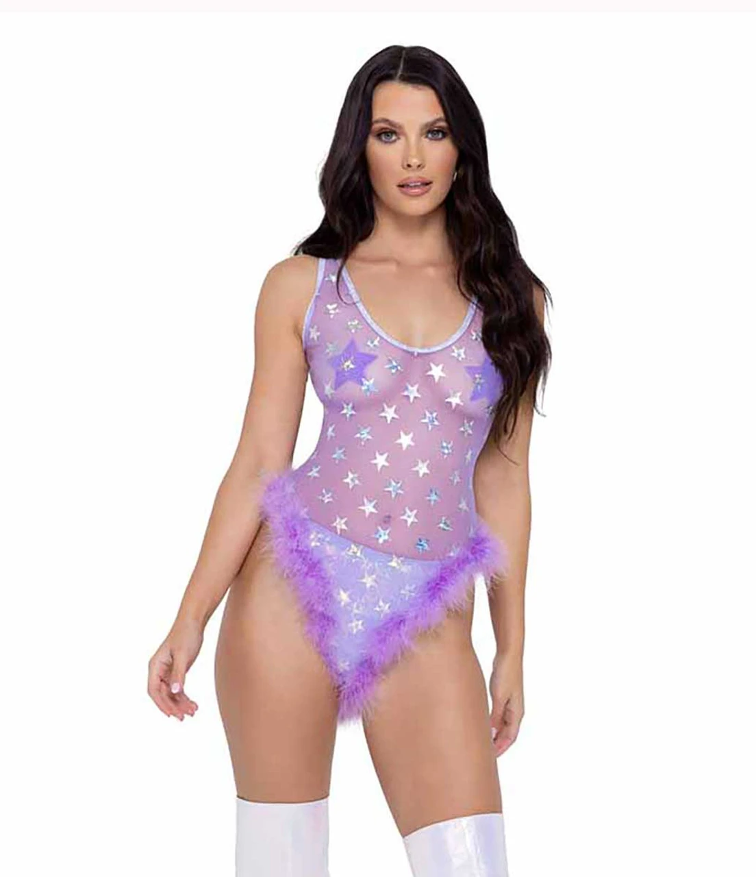 LOOK RAVE-TASTIC in this Sheer Stars & Marabou Trim Romper! Featuring a sheer bodice with glitter stars and marabou trim accents, you’ll be a vision of style and comfort.Β