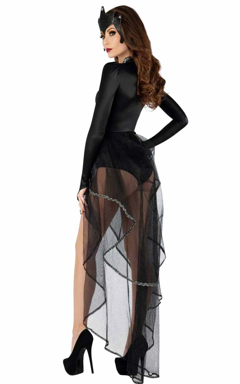 Black romper with black and silver lace detailed open neckline, high collar and puff sleeves, with glitter mesh drapped skirt with black faux rhinestone and black and silver trimmed hem. Includes gem embellished head piece.