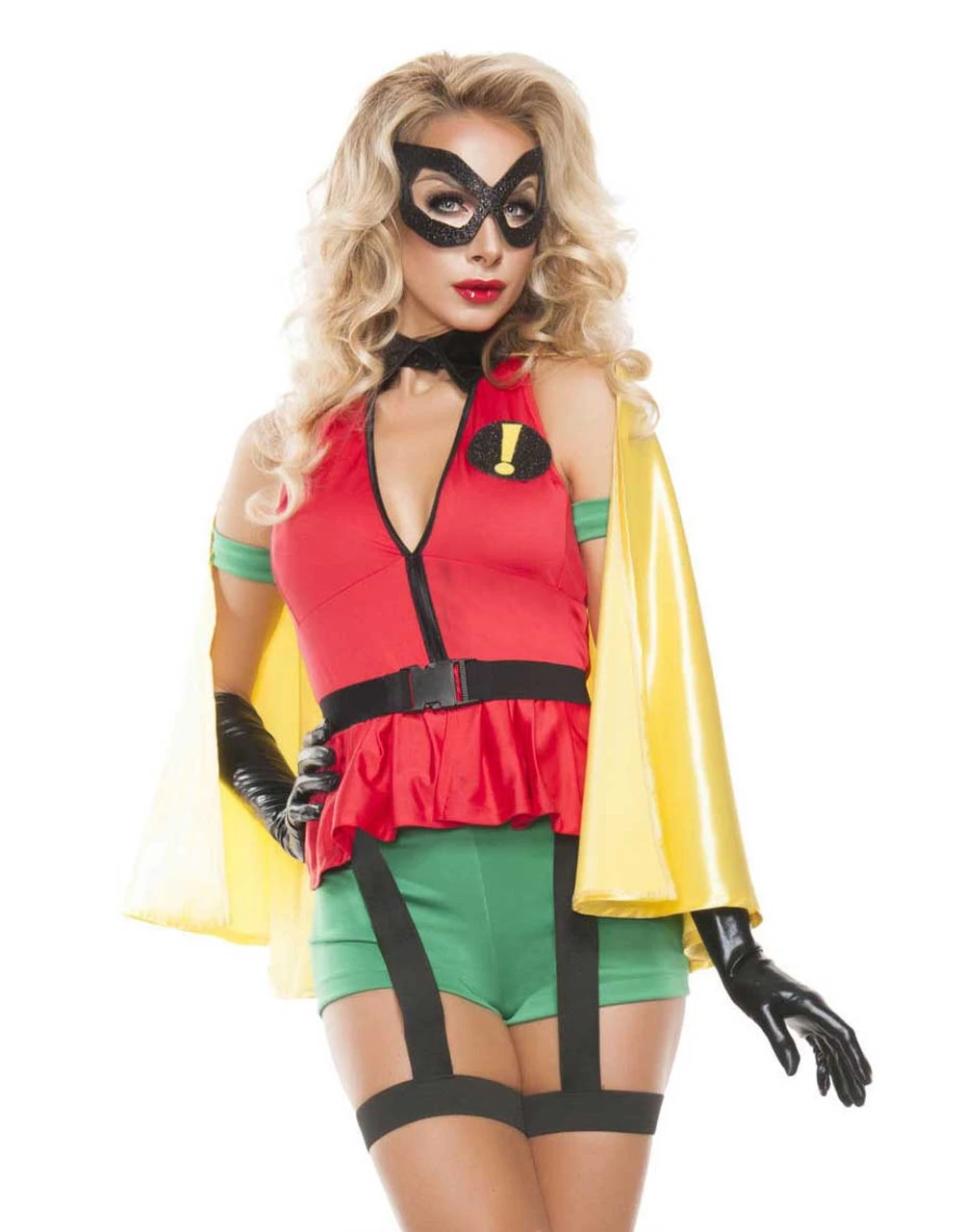 Sidekick Girl Costume includes PeplumTop, Shorts with attached Garters, Cape, Mask, Arm pieces and Belt. (Gloves sold separately)