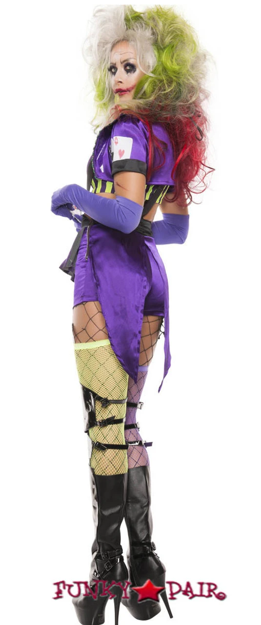 Villain costume includes stripe crop top, high waisted shorts, Bolero, Suspenders and neck piece. (Gloves, hosiery, knee pads and cards not included) Wig sold separately