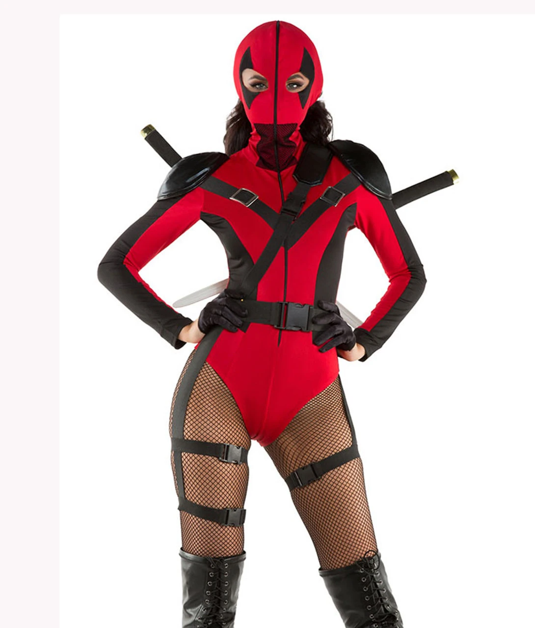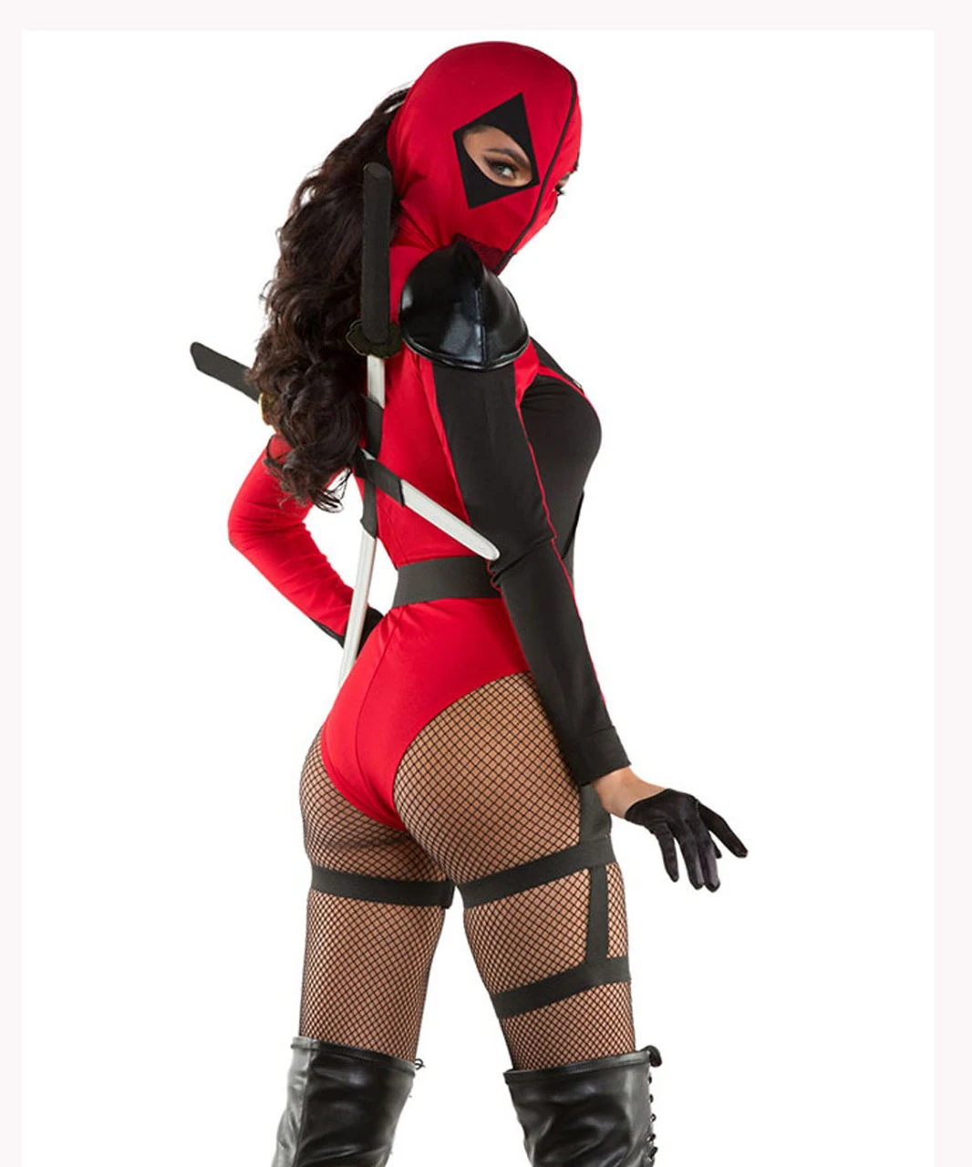 Ninja costume costume includes red hooded romper with center front zipper, black shoulder pads, belt and swords. (gloves and hosiery not included)